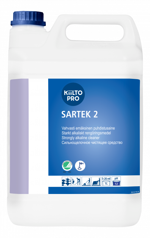 Močno alkalno čistilo za odstranjevanje olja ali trdovratne maščobe Kiilto Sartek 2 je namenjeno ročnemu ali strojnemu čiščenju.